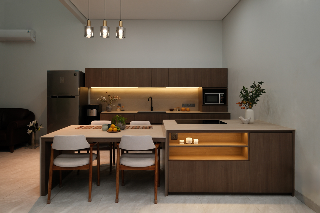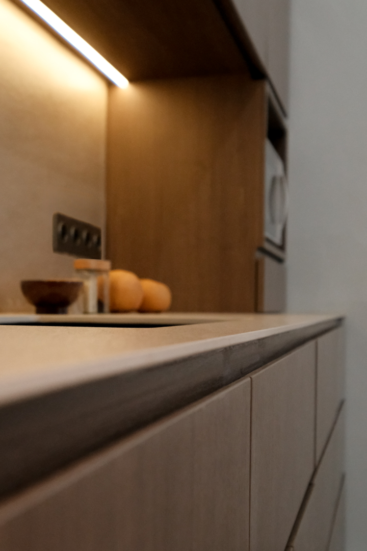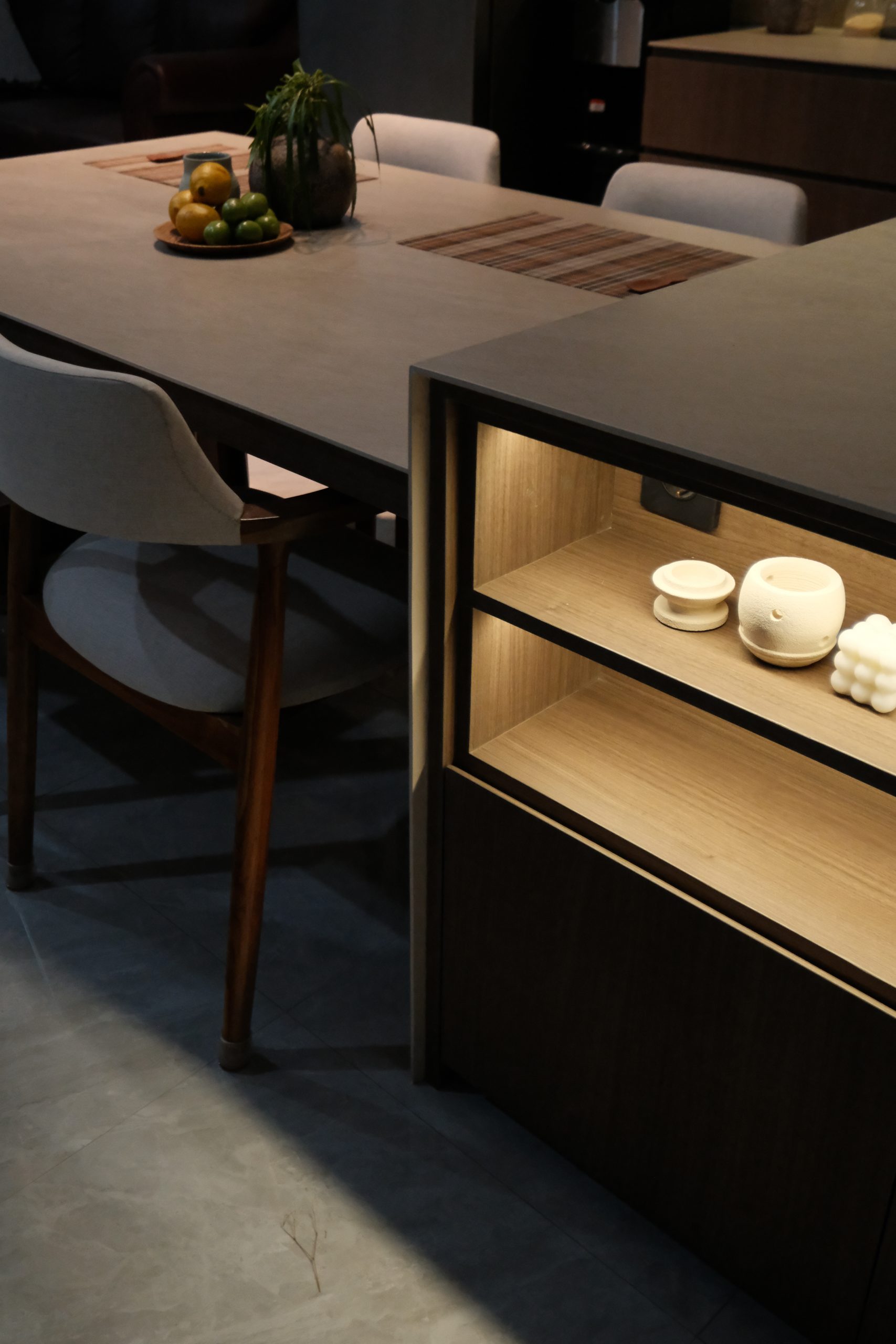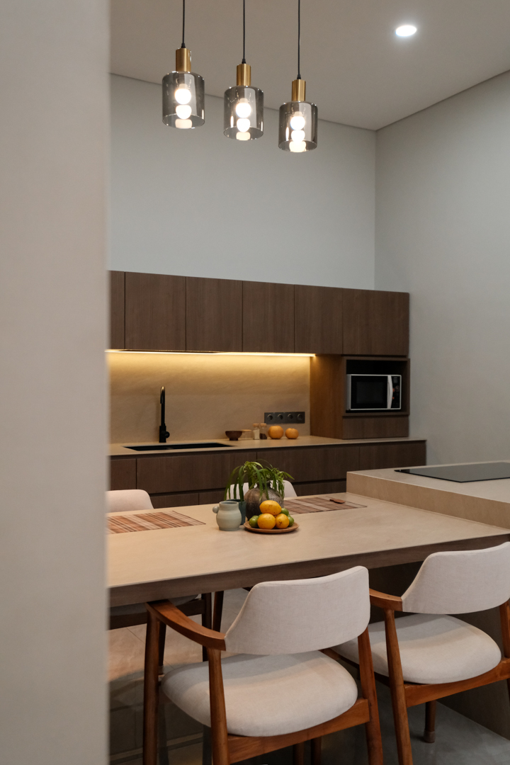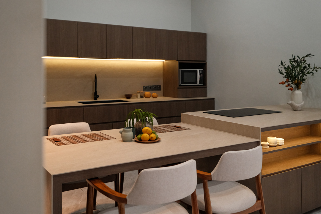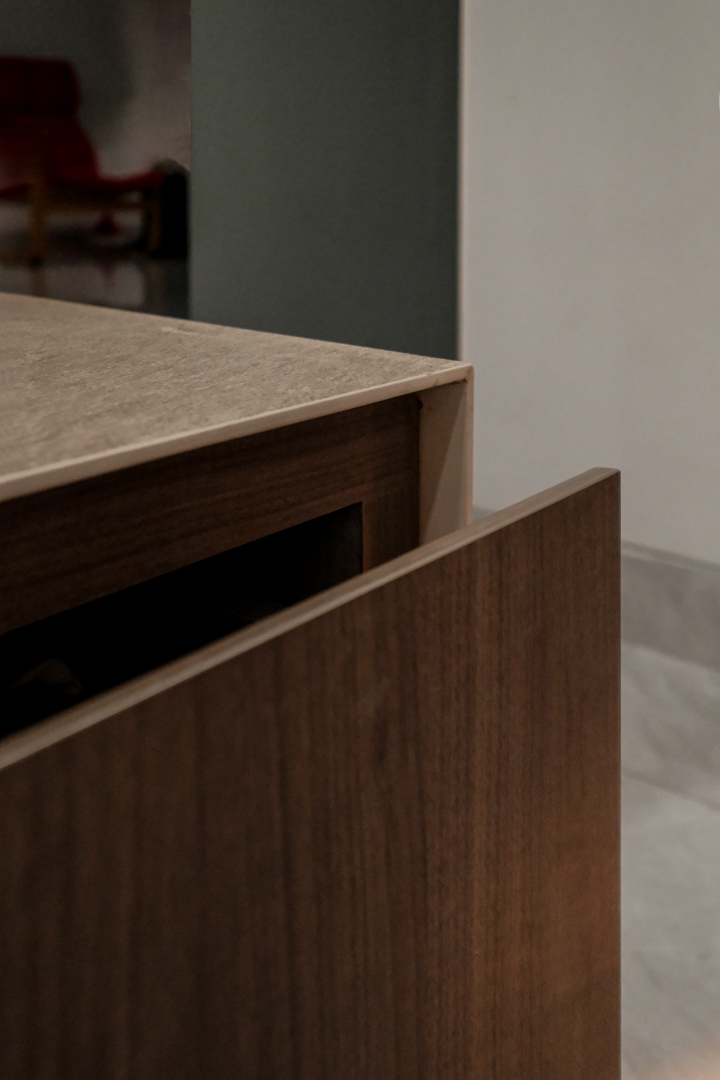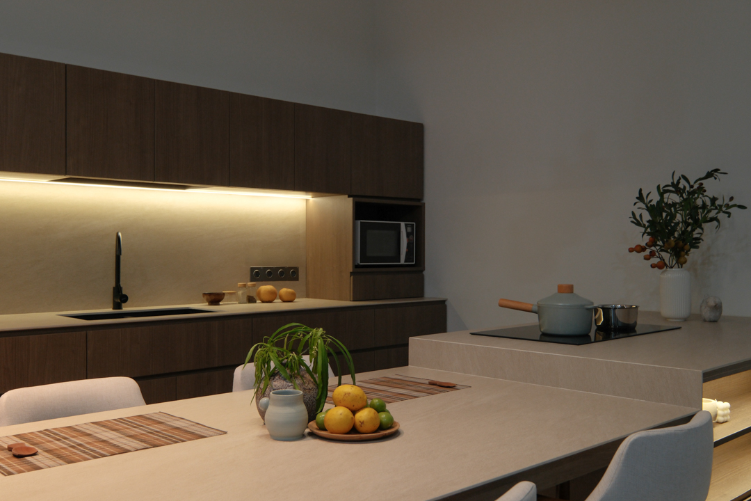 Warmth emerges through the harmony of wood textures and soft, concealed lighting.