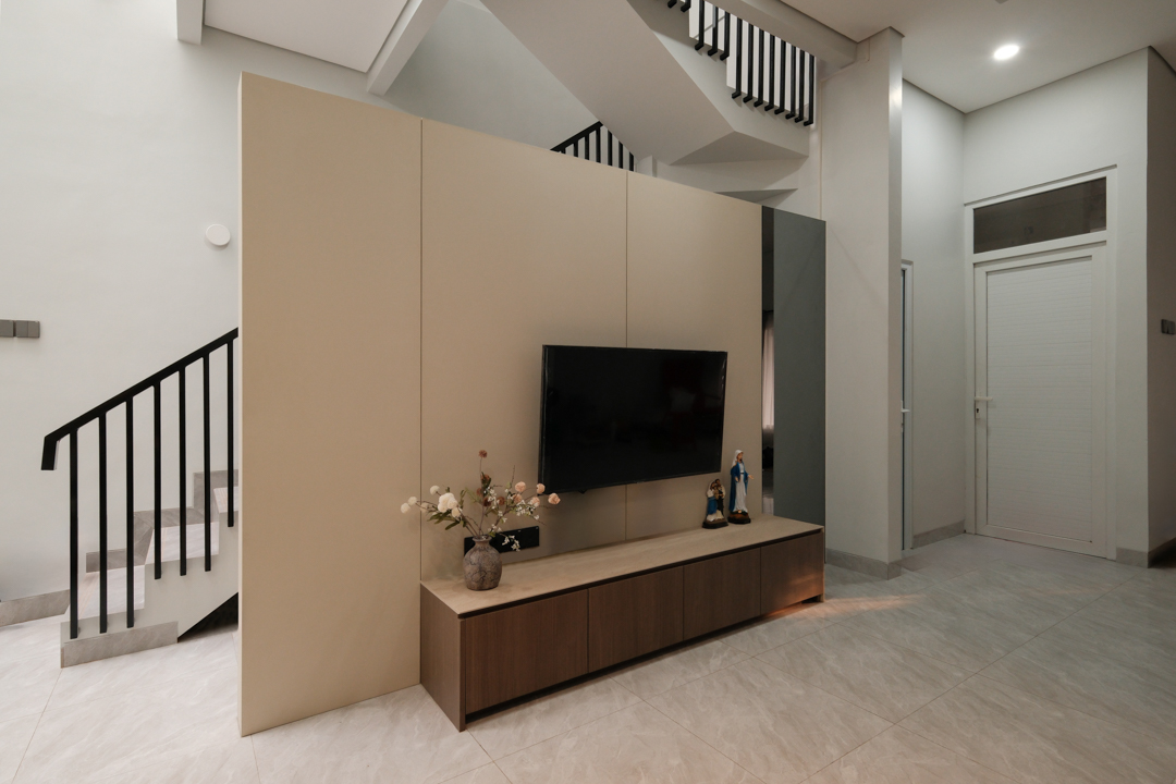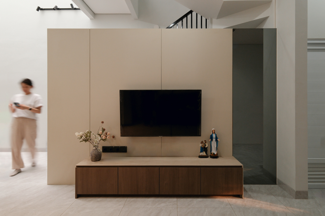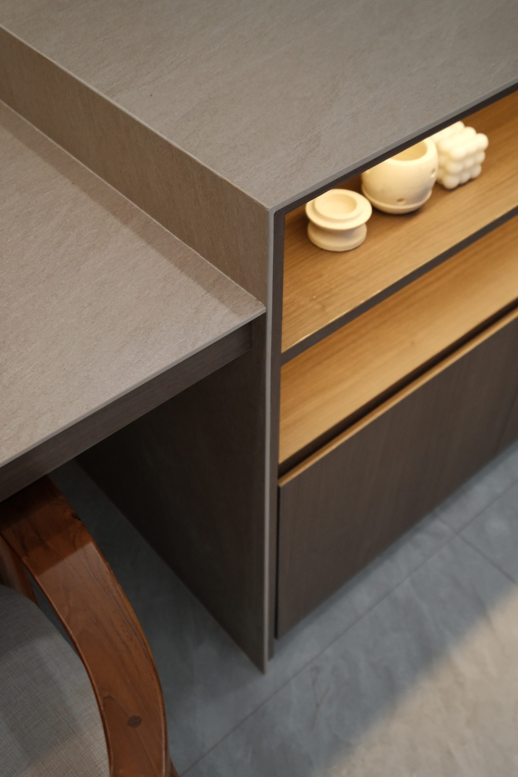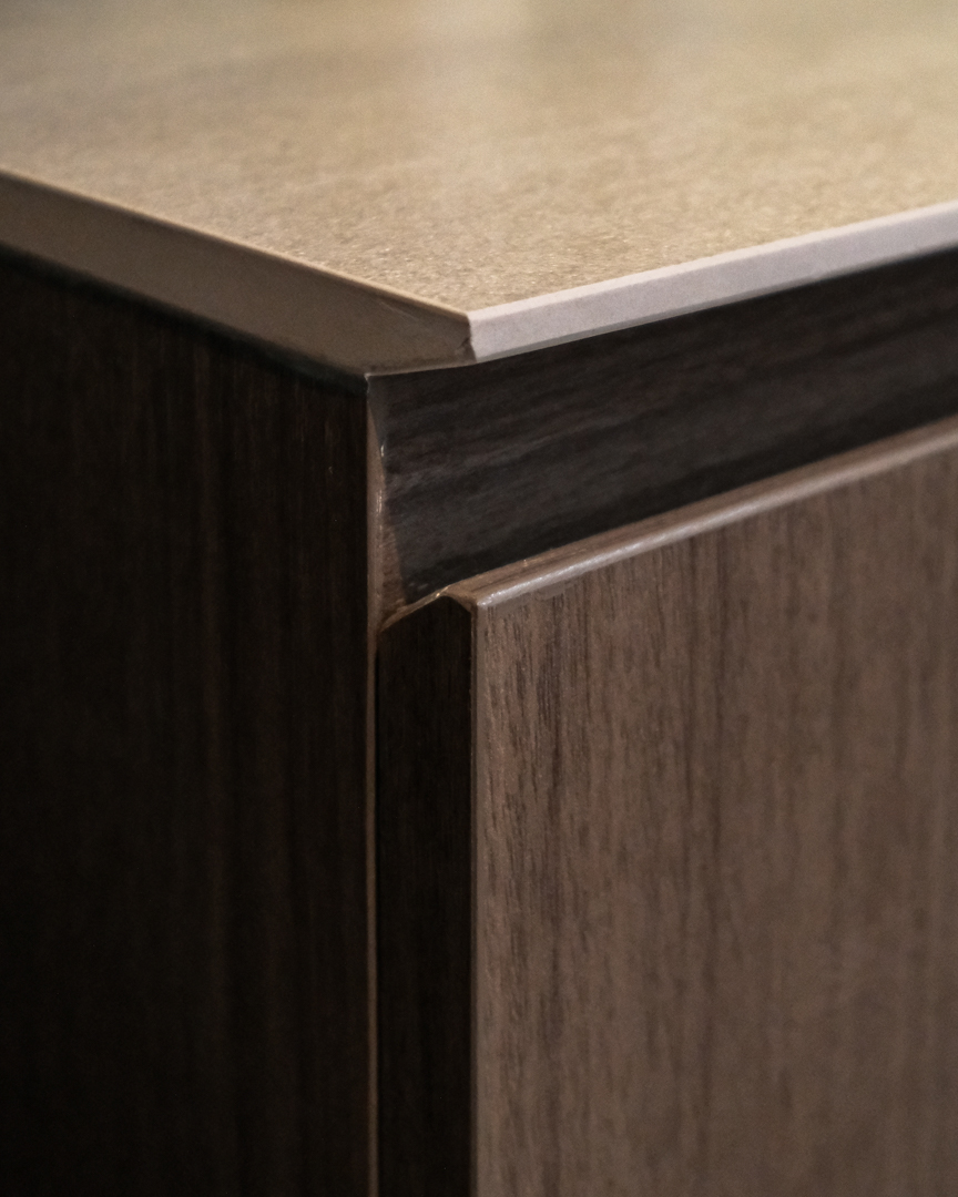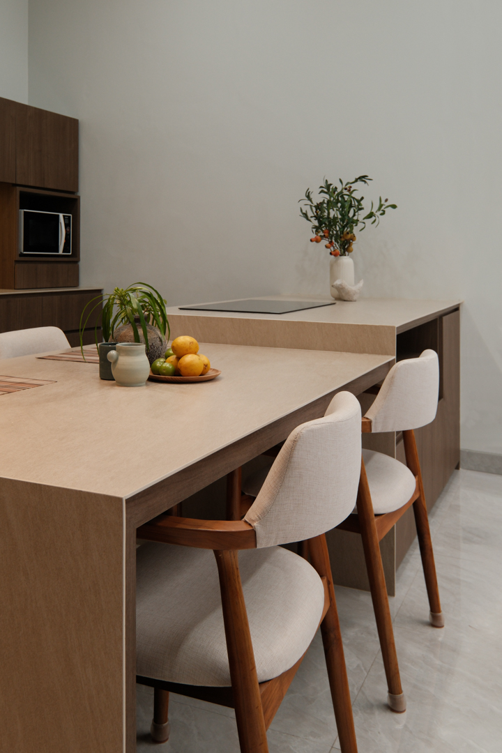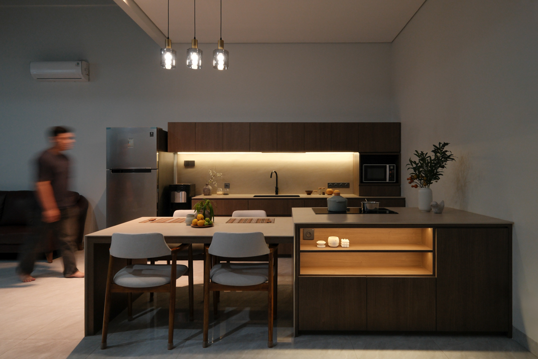 Warmth emerges through the harmony of wood textures and soft, concealed lighting.